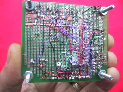 I like wire-wrap for one-off type projects such as this. I can wire-wrap a board like this in a couple hours. I find it to be highly reliable and changes can be made fairly easily. I now use a ground and power copper strip that I solder to - I find this goes a little quicker and results in a better power distribution system. I mounted the transmitter board directly on the lithium battery - makes a nice, tidy package. The board has an on-board 5V 78L05 regulator which is powered by the lithium batteries 9 to 12 volts. This could be made more efficient with an LDO regulator and lower voltage battery. The antenna is just a length of copper wire. The length is important - make sure it matches the quarter wave frequency of your transmitter/receiver. Check the documentation that comes with your RF modules.