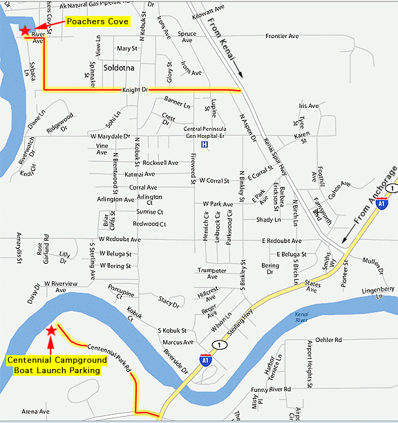 Directions to Poacher's Cove: (Driving down from Anchorage) As you come into Soldotna from Anchorage on the Sterling Hwy. please turn right onto the Kenai Spur Hwy. at the
