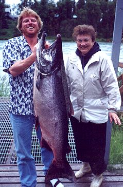 | Martha Slusser is from Dillsburg, PA and is a spry 73 years young. This was her first ever fishing trip and her catch, a nice 60 pound whopper, weighed the same as her husband Martin's TWO fish he caught on consecutive days of fishing. Loren's son Mitch does the honors of hoisting the trophy. |