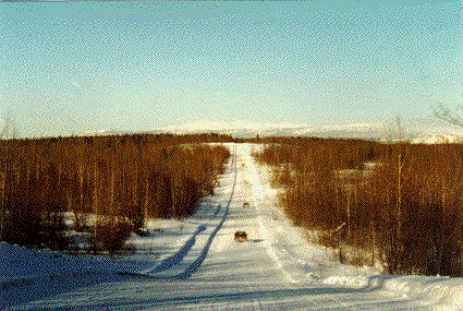 | 1996: Where 1995 had been cold, 1996 was warm. Too warm, in places; the warm rain falling on glare ice made the Blackwater Road section, normally a cakewalk, an absolute nightmare---and that was only on the second day. But by the time we reached the MacKenzie, we were running ahead of the weather: Clear and cold and an absolute joy for the Spirited Driver. (We seem to attract this species. . . .) |