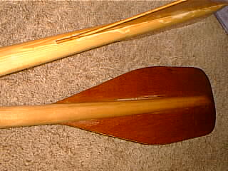 I built these kayak paddles for my double paddle canoes very quickly out of inexpensive, readily available materials. The shafts are ordinary closet rod (which usually seems to measure 1 5/16 inches in diameter). For the blades I used 1/4 inch (nominal-5mm) luan. The luan is lighter than 1/4 plywood, but it has very thin outer veneers. For my application in protected waters I think the luan should be sufficiently strong. If it isn't then I don't plan on being in a remote place where I couldn't get home!