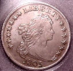 The next type is the 1st silver dollar struck at the new Philadelphia Mint. Stacks Type I dollar is the “Flowing Hair” struck in 1794 and 95. The ’94 is rare in any grade but the ’95 is doable. Mintage levels put these pieces at 203,033 struck of which 2 and 3 leaf varieties are included. Current prices range from $800 in good to $40,000 in uncirculated. Needless to say a well circulated piece provides plenty of challenge for the average collector. Next is the draped bust piece of 1795-98 type 2. Mintage levels are higher for this coin than the 1st silver dollar. This coin starts at $600 in good and goes for around $22,000 uncirculated. That is somewhat better than the last type but still challenging especially in better grades. Following comes the Type 3 Heraldic Eagle of 1798-1804. Everyone should know about the famous restrike 1804 dollar. It is a true American rarity. We will leave this one for the Bowers and Merena crowd. However, the rest of the series leaves a lot of alternatives for the type collector. Coins start at the $350 level in good and go to $15,000 uncirculated.