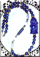 Lapus lazuli Buddha, gold antique African trail trade beads, Sea of China mother of pearl, Brazilian sodalite barrels. |