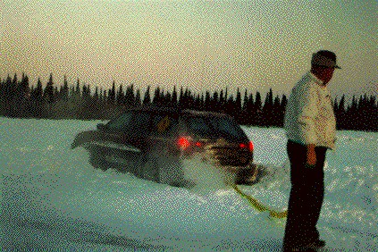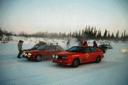| 1996: Where 1995 had been cold, 1996 was warm. Too warm, in places; the warm rain falling on glare ice made the Blackwater Road section, normally a cakewalk, an absolute nightmare---and that was only on the second day. But by the time we reached the MacKenzie, we were running ahead of the weather: Clear and cold and an absolute joy for the Spirited Driver. (We seem to attract this species. . . .) |