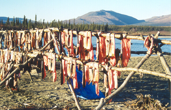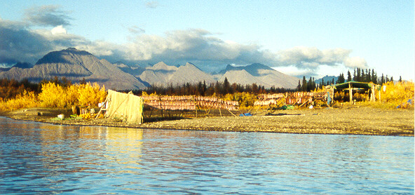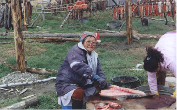 This is a traditional Inupiat Eskimo camp where Raymond, his parents, his nine other siblings and their families come each year to gather food for the long, cold winter months ahead. Eighty-foot gill nets are set to catch large amounts of chum salmon and white fish. Seining is also done to bring in fish; a 300-foot net can bring in 150-200 salmon at one time. After the fish are brought in, the women cut them, clean them, and hang them out on fish racks to dry for several days. Then they can be stored away and ready to eat during the winter. |